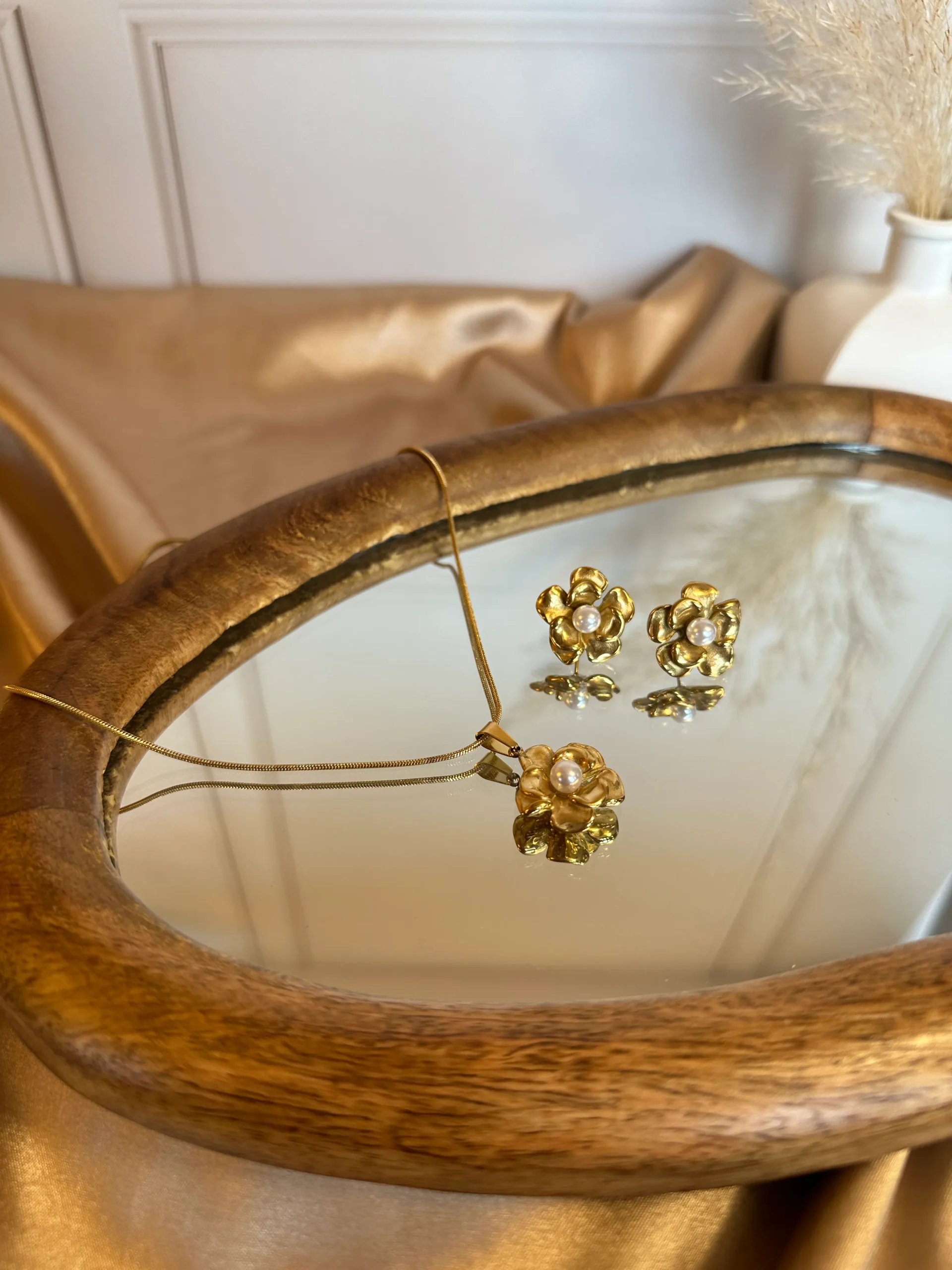 Aretes y collar , delicadeza floral que ilumina tu estilo.